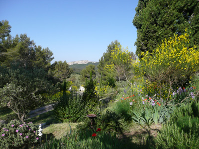 Blick vom Parkplatz Richtung Haus und Terrasse.
