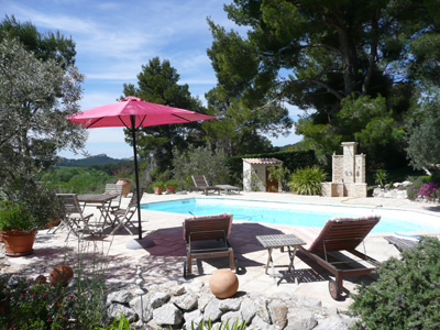 Pool mit gedecktem Sitzplatz im Hintergrund, von Westen her gesehen |